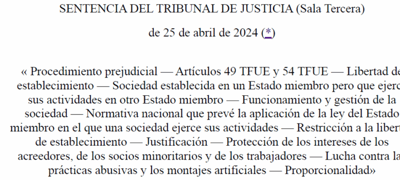 En este entorno, recientemente se ha vuelto a plantear ante el Tribunal de Justicia de la Unión Europea una singular controversia con motivo de un acto dispositivo por un apoderado, distinto de un administrador, del principal activo de la sociedad, consistente un castillo situado en la proximidades de Roma. En el asunto C-276/22, el Tribunal de Justicia, en su sentencia de 25 de abril de 2024, toma como referente el artículo 25, en su apartado 3, de la legge n. 218 (di Riforma del sistema italiano di diritto internazionale privato), que permite la transformación de sociedades italianas en sociedades extranjeras mediante el traslado de su domicilio social a otro Estado miembro, a condición de que tal traslado resulte válido tanto en el Estado miembro de origen como en el Estado miembro de destino. La cuestión, sin embargo, se suscita cuando el Tribunale di Roma acude al artículo 2381, párrafo segundo, del Codice Civile, para considerar ilícita la delegación de facultades del consejo de administración de una sociedad de responsabilidad limitada en un tercero distinto de sus miembros y, por lo tanto, la transmisión del castillo que constituye el activo principal de la sociedad, debido a que esta desarrolla la parte principal de sus actividades en el territorio italiano.